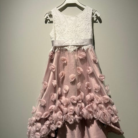 Beige kjole fra Name it i str 128 (7-8 år) med fôr i 100% bomull. Øverste delen er satinert, har sydd blomster under brystet, og nedre delen ligner på tyll.