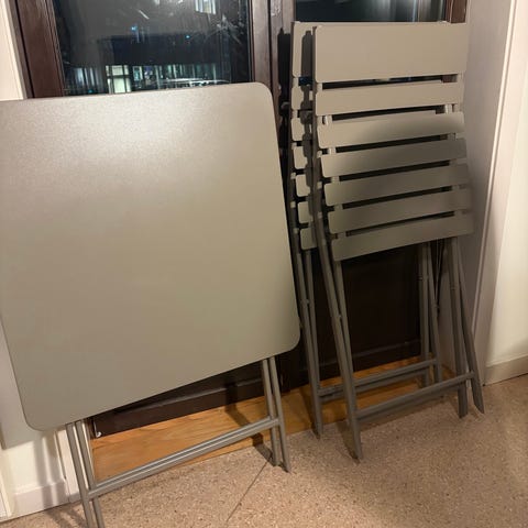4 stk hvite utestoler med armlener kjøpt på Ikea. Stolene finnes ikke lenger i hvit på Ikea, kun sort og beige. Ny pris kr 695,-. Selges for kr 300,-pr stk. Utebordet (73x113 cm) kan også kjøpes til dersom ønskelig, kr. 300,-. Stolene kan stables.