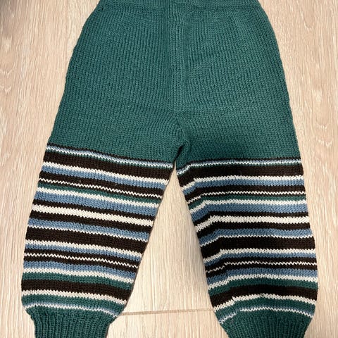 Hjemmestrikket ullbukse i str 5-6 år . Benlengde fra skritt 40,5 cm. Blågrønn i fargen.
