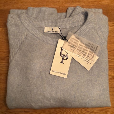 Helt ny og ubrukt kremhvit genser i ull/kasjmir fra Urban Pioneers selges til halv pris av ny pris.