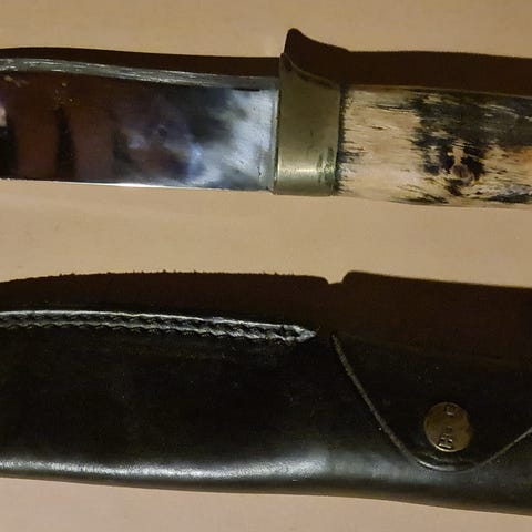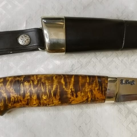 En solid tur og brukskniv. Kniven er lagd av Knivmaker Morten Jahn, bladet er fra knivsmed Arild Mauseth. Bladets lende er på 13 cm. Total lengde på kniven er 25,5 cm. Front holk lagd av elg horn og lærskaft. En litt samekniv inspirert kniv med et personlig preg. Kniven kan sendes med sporing mot at kjøper bekoster frakt eller så kan den hentes i Drammen.