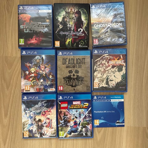 Pakke med Playstation 4 spill inkludert titler som KeyWe, Torment Tides of Numenera Day One Edition, Puyo Puyo Tetris, Metal Gear Survive, og flere. Spillene dekker ulike sjangere og aldersgrupper, med aldersanbefalinger fra 3 år til 18 år.