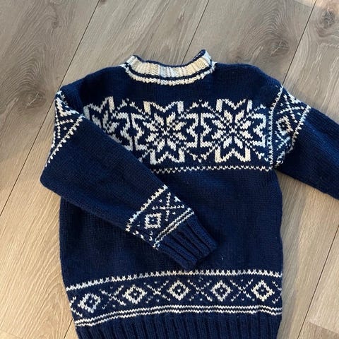 Selger en hjemmestrikket jakke. Passer ca 8-10 år.