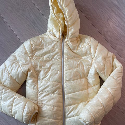 Flittig brukt jakke med stilige metallic detaljer. Må tapes/sys på ene lommen, og har et par små flekker som sikkert går vekk ved litt målrettet vask.
