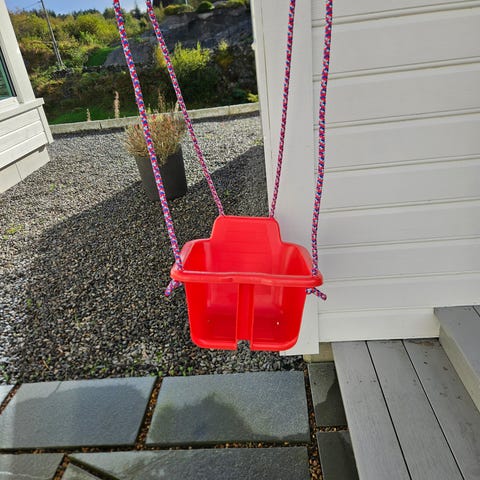 Huske med belte og fester. I god stand, funker som den skal. Solid plast.