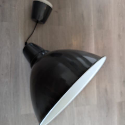 Pent og lite brukt IKEA pendellampe, type T0418, med glasskjerm og kjede og oppheng i mørk metallfarge selges på grunn av ominnredning. Lampen er totalt ca. 50 cm høy. Lampen fungerer som den skal.