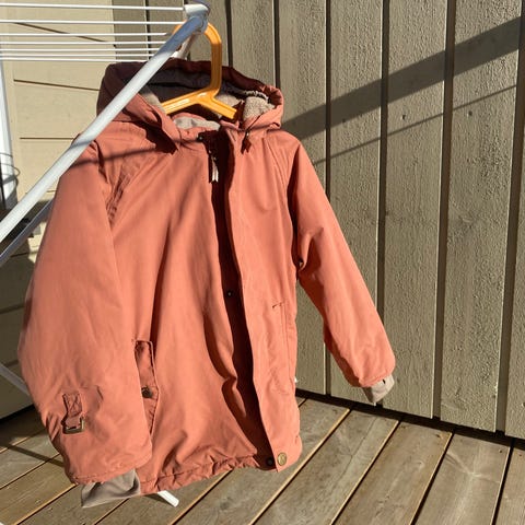 MINI A TURE jakke i størrelse 110. Uten anmerkninger. Jakken har hette og elastiske mansjetter, med en stjerneformet refleks i lommen. Høst/vårjakke. Fin dus rosa farge.