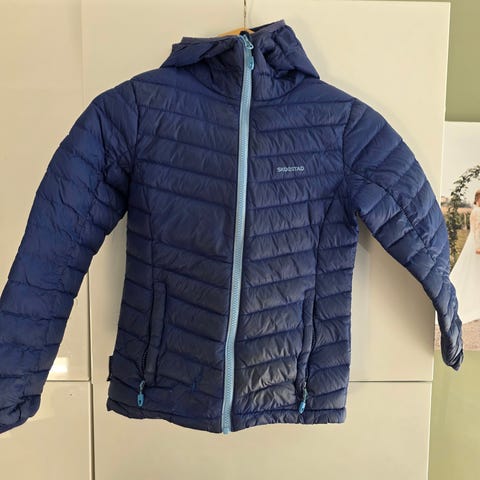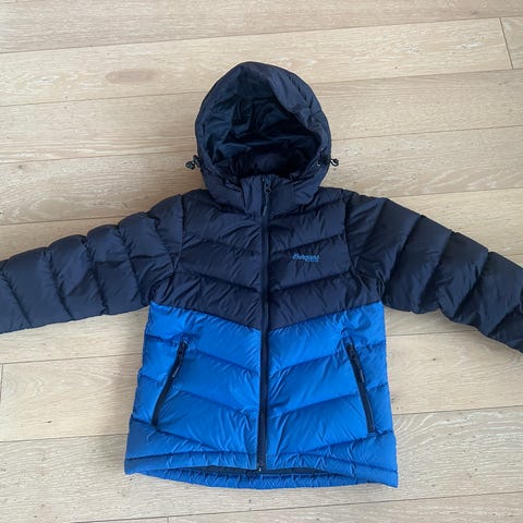 Bergans dunjakke i størrelse 164 for jente selges. Jakken er god og varm, sort og blå/grå med lyselilla glidelåser. Det er et lite hull foran nederst og på den ene armen, som er lappet, knapt synlig. Jakken selges derfor billig; 300 kr! Nypris 1999, kun brukt 1 sesong av 1 barn.