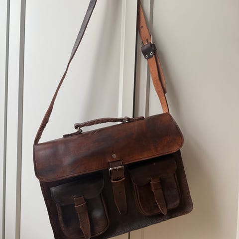 Sliten, men kul. En eller flere av glidelåsene må repareres, en lomme på innsiden sys, en av metall-stroppene er midlertidig fikset med ståltråd, men må antakelig repareres for å tåle bruk. Jeg tror dette er en klassisk Delton bag, men er ikke ekspert.