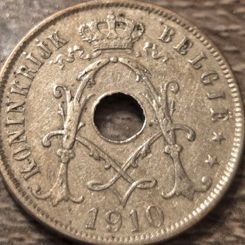 Belgia 1908 25 Centimes mynt med hull i midten. Mynten er laget av metall og har en diameter som passer for samling eller numismatisk interesse. Den har et kongelig emblem på forsiden og verdien 25 centimes på baksiden, dekorert med bladmotiver.
