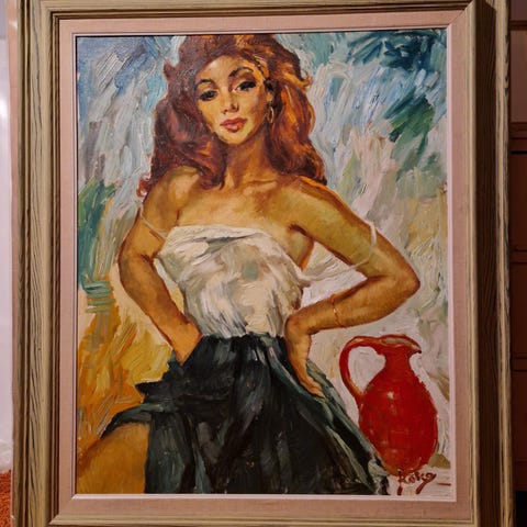 Rodolfo M. Jara Maleri maleri som viser et fargerikt bylandskap med bygninger i ulike farger og tre person som går i gaten. Litografiet er signert av kunstneren. Bildet har en ramme i lys farge og et passepartout rundt motivet. Kunstnerens biografi og utstillingshistorikk er inkludert på baksiden av rammen.