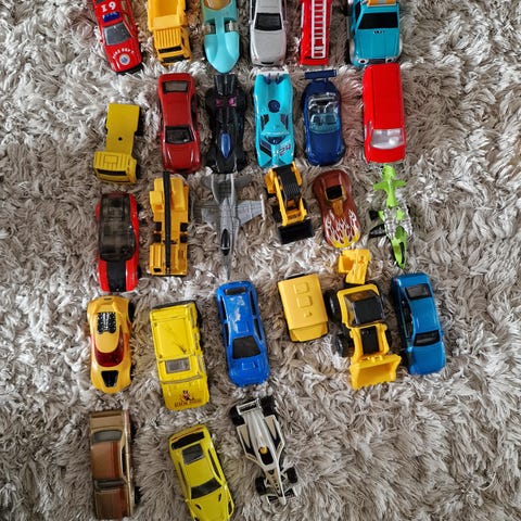 Selger bilpakke. Dette er 33 biler og 1 fly. Jeg vet ikke merkene. De fleste bilene er av plast, og noen få er av metall. Har bruksmerker, men er i stand til å lekes og kjøres med.
