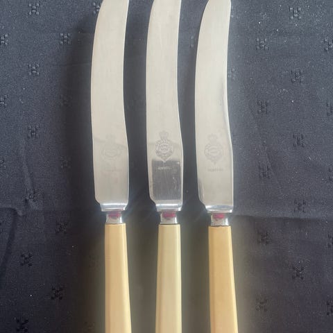 Nydelig smørkniv, ca 26 cm lang. Skaftet har en skade (se bilde).