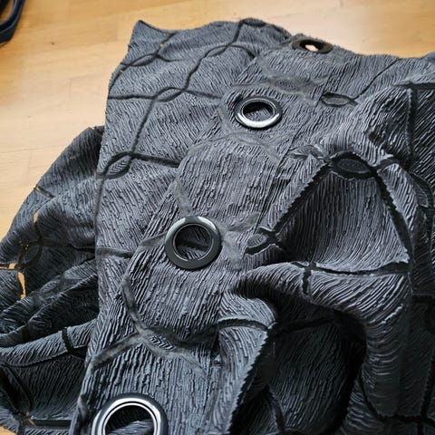 Fine svarte og beige gardiner med dusker.