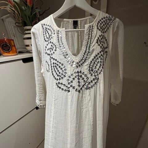 Riccovero festkjole i grå/blå farge, størrelse 40.. Kjolen har korte ermer med dekorative detaljer og en elegant passform. Har en åpen rygg