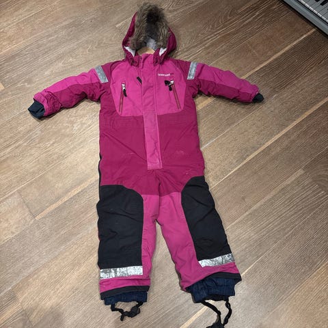 Didriksons barnedress i størrelse 100 i rosa farge. Dressen er designet for jenter og egnet for utendørs bruk. Materialet og detaljer er tilpasset for komfort og beskyttelse mot værforhold.