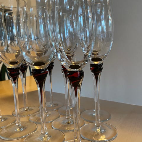 Jeg selger 5 flotte rødvinsglass med fin jule- dekor. 1 akevittglass.