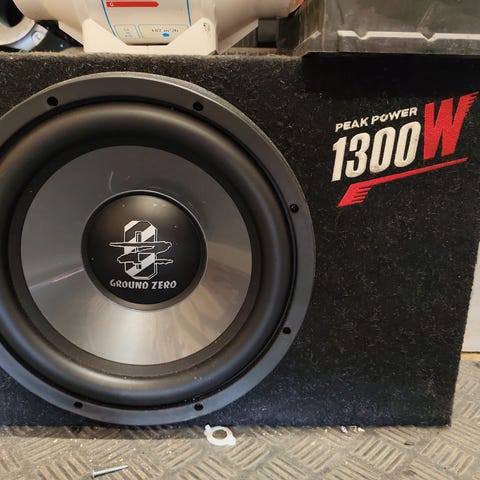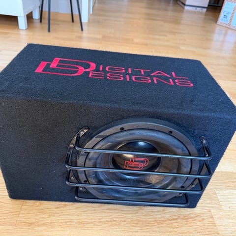 DD Audio subwoofer i portet kasse, med Hifonics forsteker.