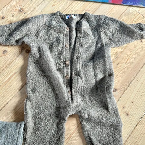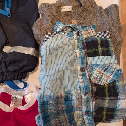 Barneklær i størrelse 74, flerfarget, designet for unisex. Inkluderer ulike plagg som heldresser, gensere, bukser, vester og sokker. Materialene varierer, med fokus på komfort og funksjonalitet for små barn.