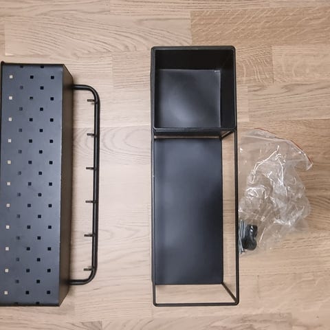 IKEA Alberto Meda kleshengere laget av svart metall. Har en øvre hylle for oppbevaring og fem kroker for oppheng av klær eller tilbehør. Veggmontert design som gir praktisk oppbevaring i gang eller garderobe.