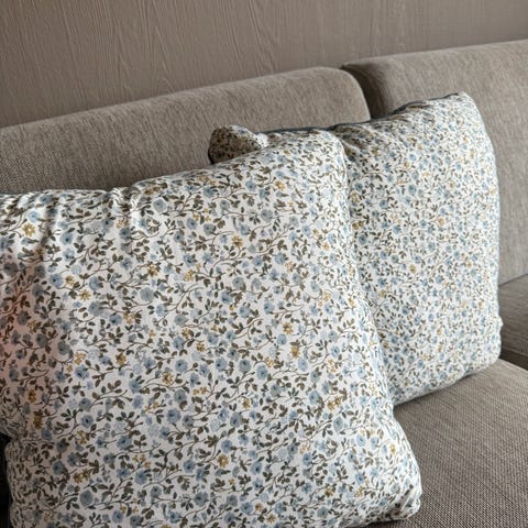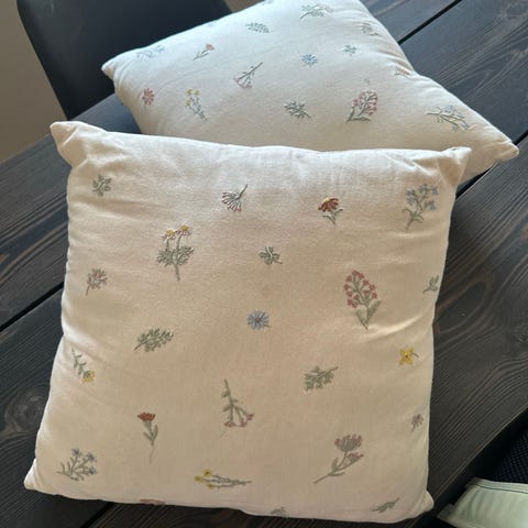 To stykk Princess putetrekk selges samlet. Den ene puten har bladprint og den andre har print av delikate blomster. 🌸 Begge trekkene er pent brukt og har ingen synlige bruksmerker. Nypris 249,- per pute, total nypris var 498,-. ✨