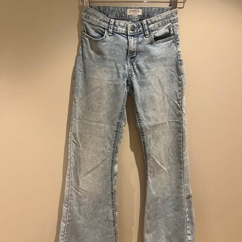 Buksen er mørk blå og skal se litt /slitt’ ut.