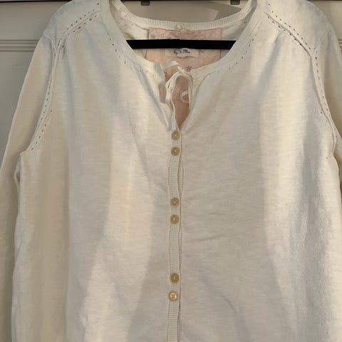 Jakken har knapping foran og blondeavslutning på ermer og utringing