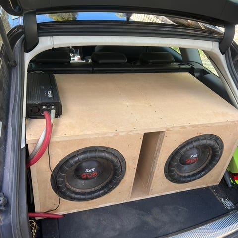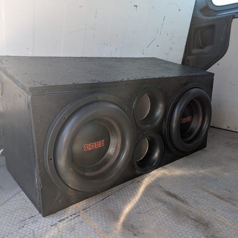Basskassen er laget av 22 mm MDF, godt avstivet og bygget for å tåle høyt lydtrykk. Kassen står nå lagret.