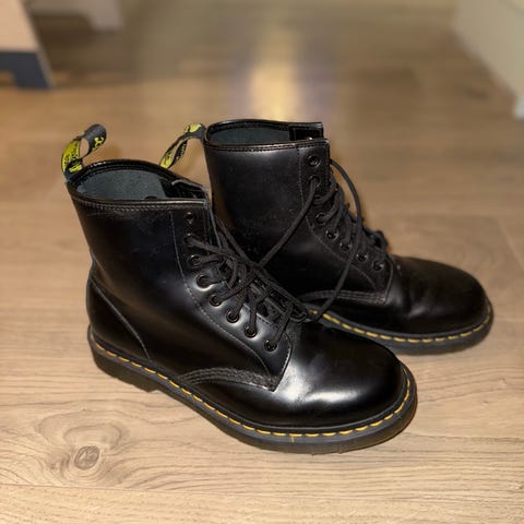Dr. Martens Støvler i svart skinn, størrelse 40. Støvlene har en klassisk design med gult sømdetalj og robust såle med godt grep. Egnet for både hverdagsbruk og lettere utendørsaktiviteter.