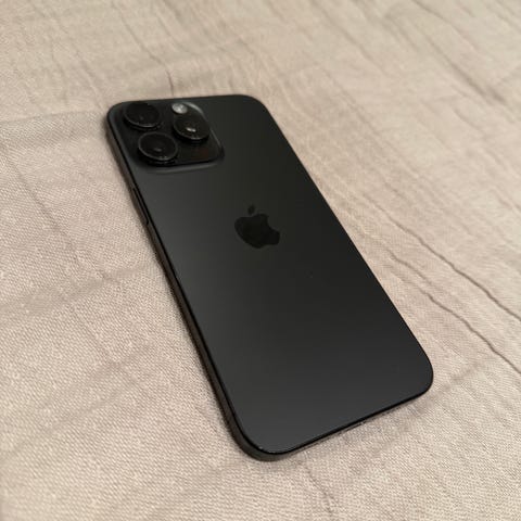 Apple iPhone 15 Pro mobiltelefon med 256 GB lagringskapasitet i svart farge. Telefonen har et robust design med et flatt skjermpanel og et kamerasystem med flere linser på baksiden. Enheten er kompatibel med moderne mobilnettverk og tilbyr avansert ytelse for daglig bruk.