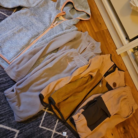 6 overdeler og 3 bukser. Det er et lite hull i den ene buksen og genseren men fortsatt mye bruk igjen.