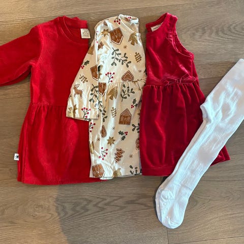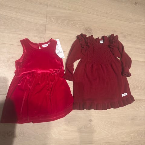 Nydelige julekjoler i gull og rød velur i str 74. Ingen bruksmerker, da de nesten ikke er brukt. Den røde kjolen har body under.