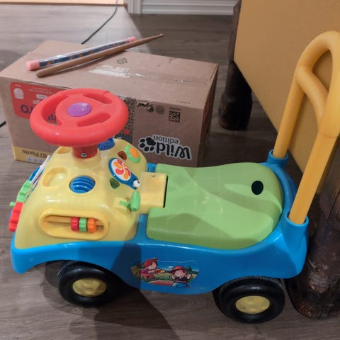 Kiddieland Ride-On bil med innebygde leker. Farge: blå, grønn og rød. Laget av plastmateriale. Egnet for små barn som et kjøretøy for lek og motorisk utvikling.
