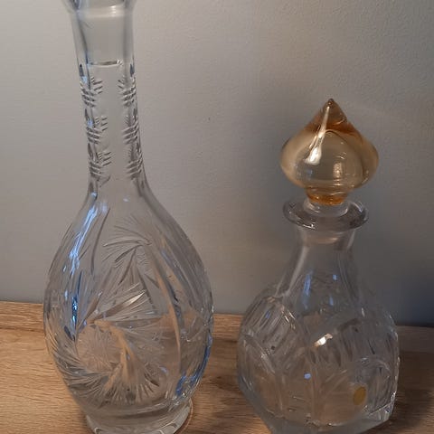 Vintage presset krystallkaraffel i diamantmønster. Høyde med propp 29 cm, uten 23 cm, diameter 10 cm. 6 drammeglass i samme stil/mønster, høyde 6 cm og diameter 4 cm. Alt er helt uten lyter/merker. Selges samlet.