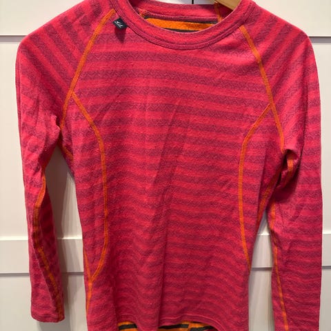 Kari Traa 100% merinoull, str. L, rosa / grå stripete, mansjett med rysjer, merke på erme, eldre modell, lite brukt