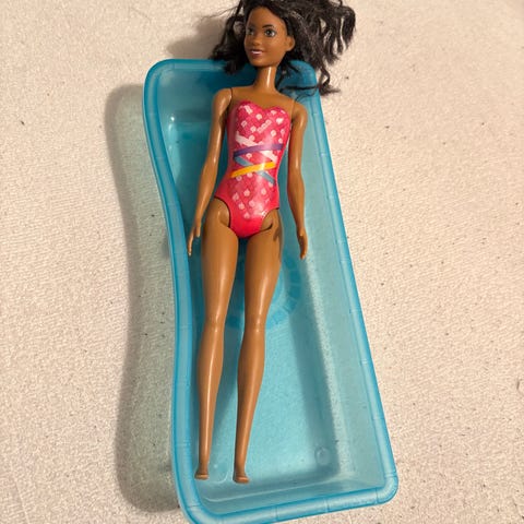 Barbie dukke med langt blondt hår, iført sølvfarget topp og blått skjørt med hvite mønstre. To ekstra skjørt medfølger, ett blått med hvite mønstre og ett rosa med flerfargede mønstre. Dukken er egnet som leketøy for barn.