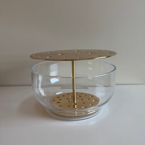 Fritz Hansen vase laget av klart glass med et dekorativt messingdeksel med hullmønster. Passer til å arrangere blomster eller som dekorativ gjenstand i hjemmet.