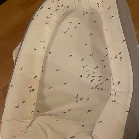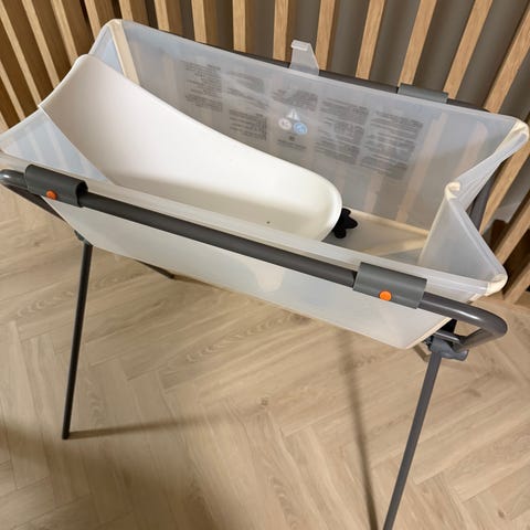Selger et Stokke Flexi Bathe med tilhørende stativ, slange og nyfødtstøtte.