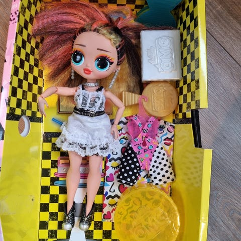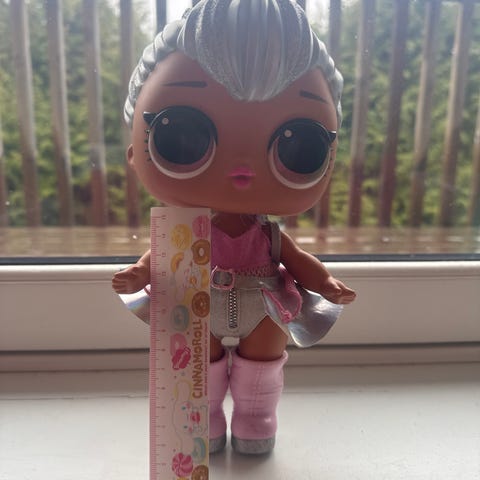 L.O.L. Surprise dukke med sølvfarget hår, store øyne og rosa antrekk inkludert støvler. Dukken leveres med en liten grå ryggsekk som tilbehør. Stor dukke, baby kitty ☺️