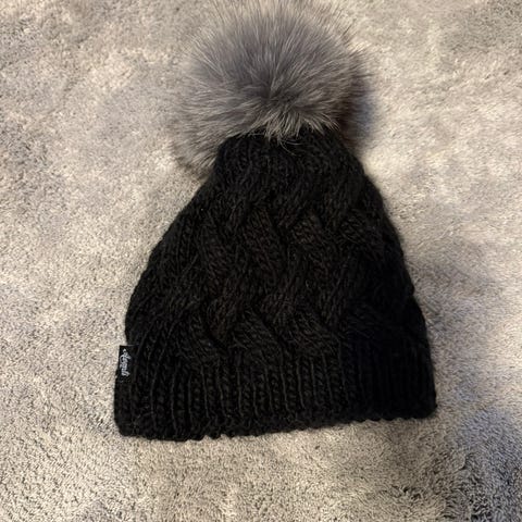 Nydelig grå lue med dusk. 100% akryl.