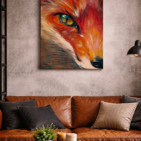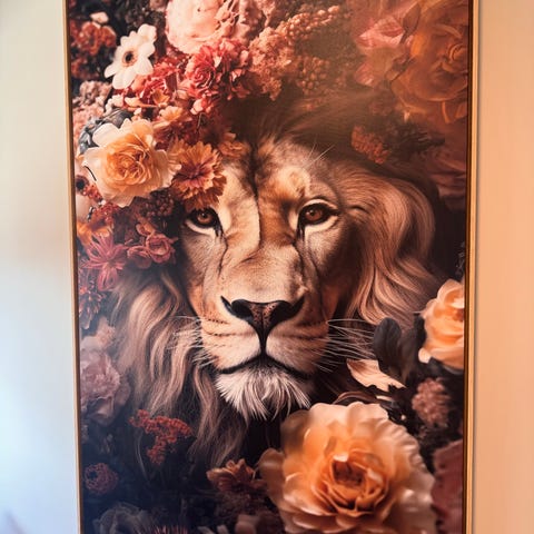 Maleri som forestiller et høylandsfe med lange horn i en abstrakt kunststil. Bildet har en fargerik og uttrykksfull bakgrunn med røde, hvite og svarte nyanser. Maleriet er firkantet og har en ramme som vises på bildene.