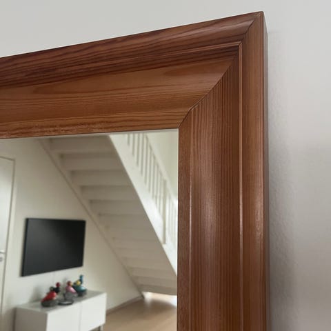 Talgø speil i tre og glass. Tot. bredde: 77 cm. Tot. høyde: 99 cm, speil bredde: 52 cm. Speil høyde: 95 cm.