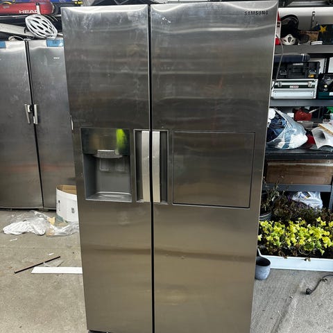 Samsung side-by-side kjøleskap i rustfritt stål med is- og vannautomat.