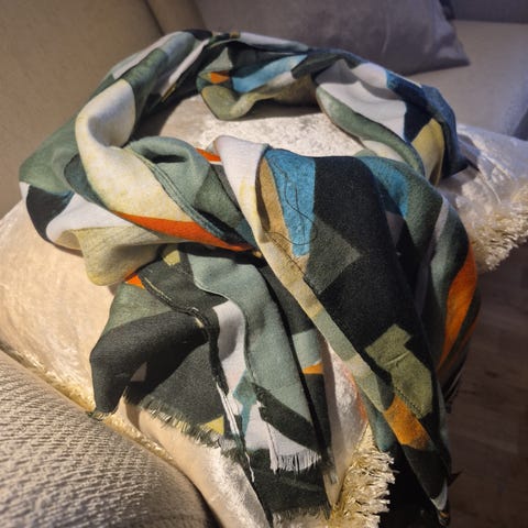 Nydelig delikat fløyel / silke skjerf, tekstiltrykk, håndlaget, fin mønster, . kan sendes + porto, skjerfet er et rundt skjerf dvs. tas på over hodet (sydd sammen på endene), fin elegant grå farge med delikat mønster