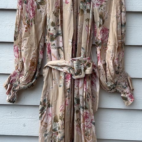 byTiMo Cotton Slub Mini i størrelse S, fargen rosa/ Bright feilds . Kjolen har lange ermer med rysjedetaljer ved mansjettene og en løs, kort passform med volanger nederst. Helt ny!