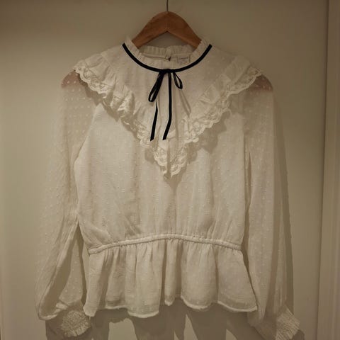 Kjempefin langermet bluse i chiffong med volangdetaljer str 164 (13-14 år) fra Lindex. Meget pent og lite brukt.