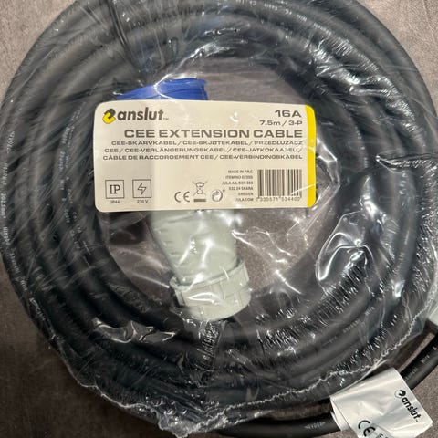 Skjøteledning på 25+10 meter med 16 A og 250 V kapasitet. Ledningen er svart og har støpsel og kontakt tilpasset standard europeisk strømuttak. Egnet for utendørs og innendørs bruk, for å forlenge rekkevidden til elektriske apparater.