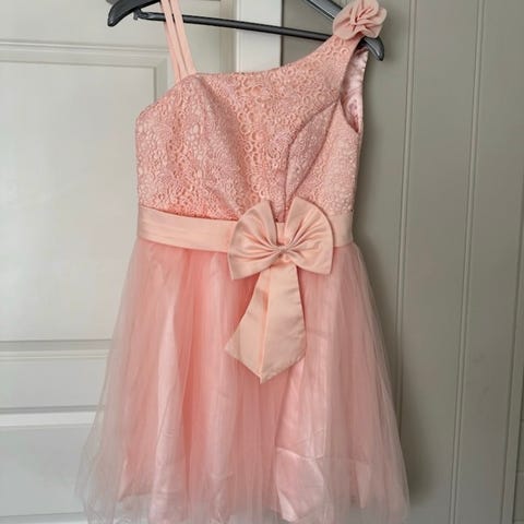 kjole i størrelse 152 og 158/XS med to varianter: en rosa kjole med tynne stropper og tyllstoff, og en svart kjole med ermeløs design og plissért materiale. egner seg til formelle anledninger eller festbruk.