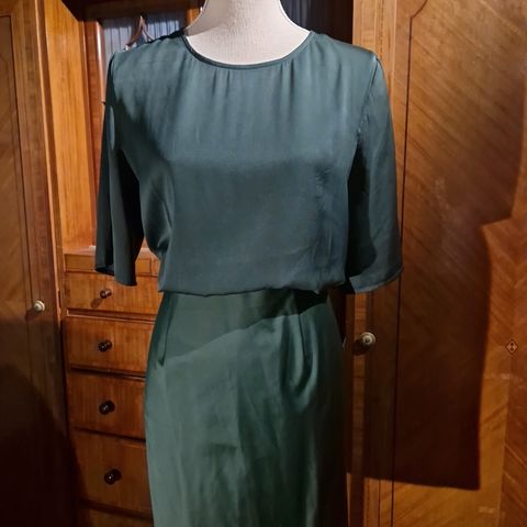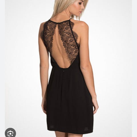 Blondekjole med lengde til knærne. Fint fall. Underkjole fra brystet og ned. Hempe i nakken på baksiden, med liten pynteåpning.