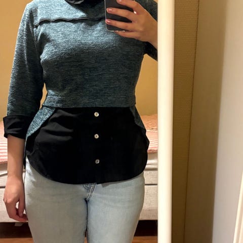 Fin burgunder genser med chiffon på kragen, ermene og nedenfor foran. Glidelås og knapp bak. Vil si den er mellom str S/M.